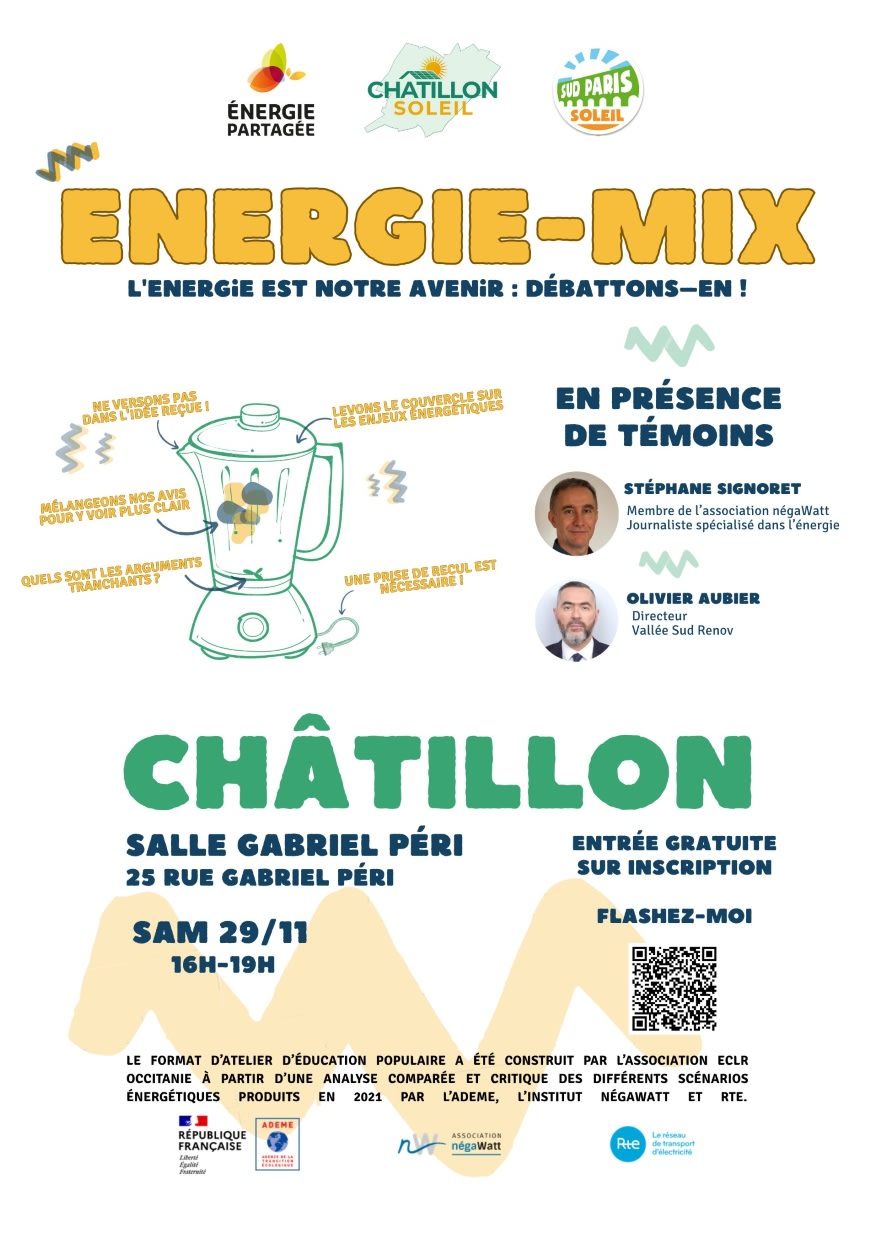 L'association Châtillon Soleil et la coopérative Sud Paris Soleil vous proposent de débattre et monter en connaissance sur un sujet stratégique et d'actualité : notre mix énergétique.