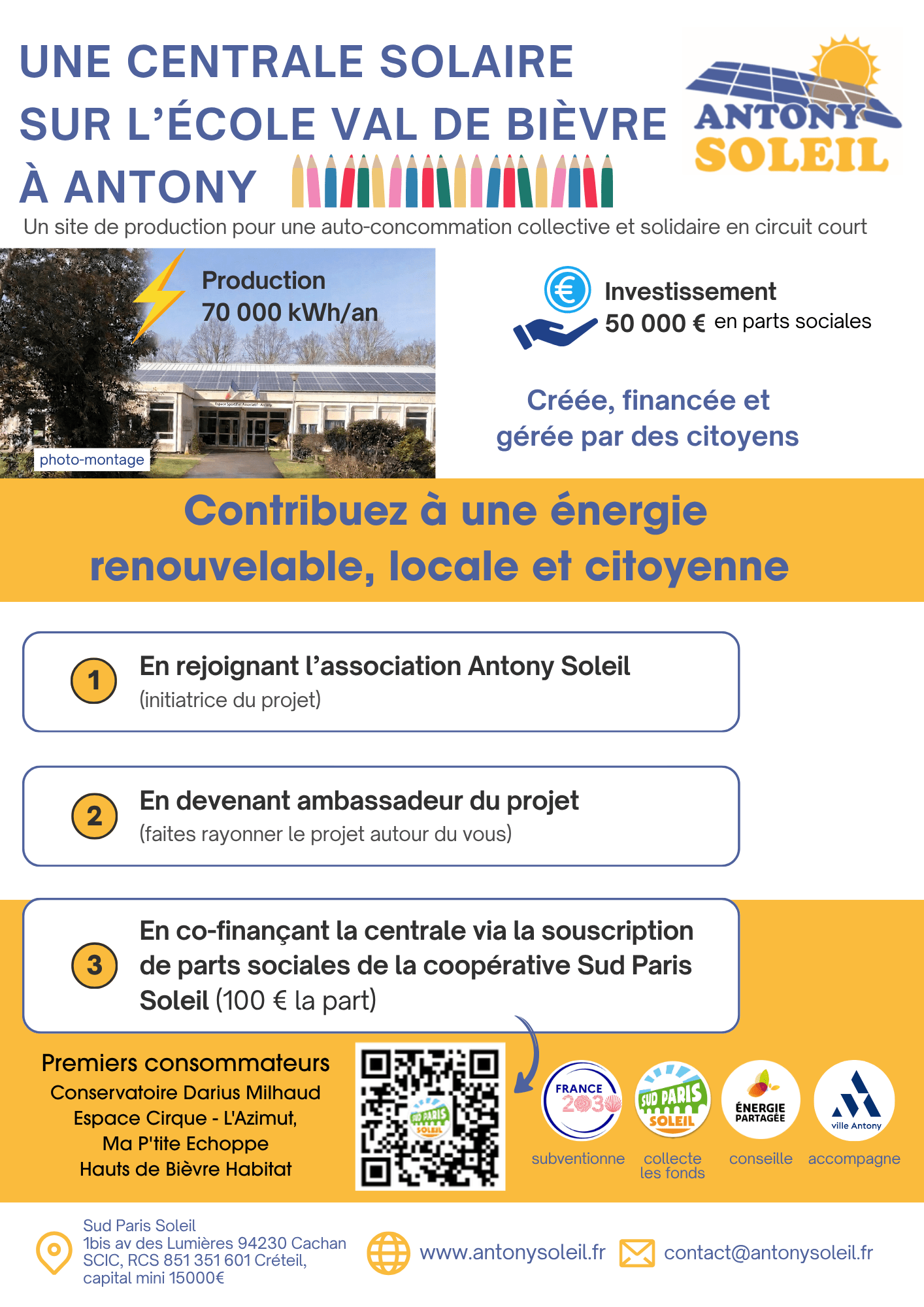 La coopérative solaire citoyenne (une SCIC - société coopérative d’intérêt collectif) a été créée le 14 juin 2019 pour produire une électricité renouvelable, à l’aide de panneaux photovoltaïques installés sur des toits de la banlieue Sud de Paris.